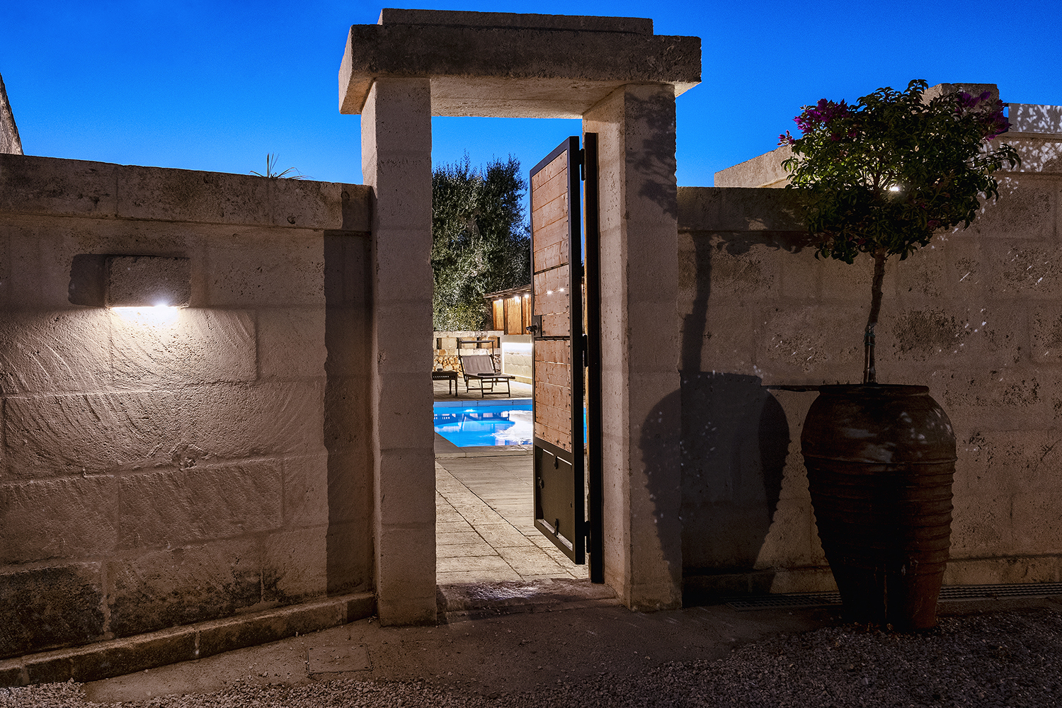 In the courtyard behind the tower you can admire the splendid swimming pool complete with a comfortable chaise longue and a jacuzzi, sunbeds and sofas, the bar area and a large and luxuriously finished dining table.